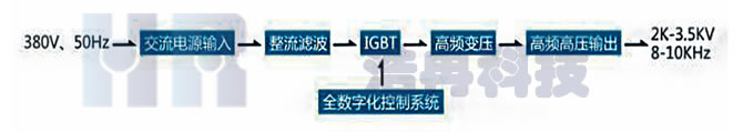 臭氧发生器的高频高压电源,采用全数字化控制技术,保证电源工作在最大功率曲线上。电源可实现过流、过压、短路、过热保护等功能,具有人机交互界面,可实现监控臭氧发生器状态。